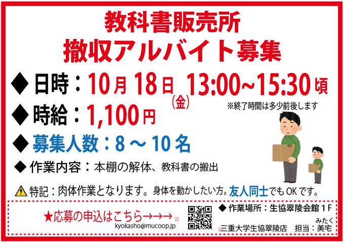 【急募!】【後期教科書販売所撤収アルバイト募集】生協の教科書販売所です。販売会場の撤収アルバイトを募集します。肉体作業となります。体力のある方、身体を動かしたい方、ぜひご応募ください。友人同士のご参加..