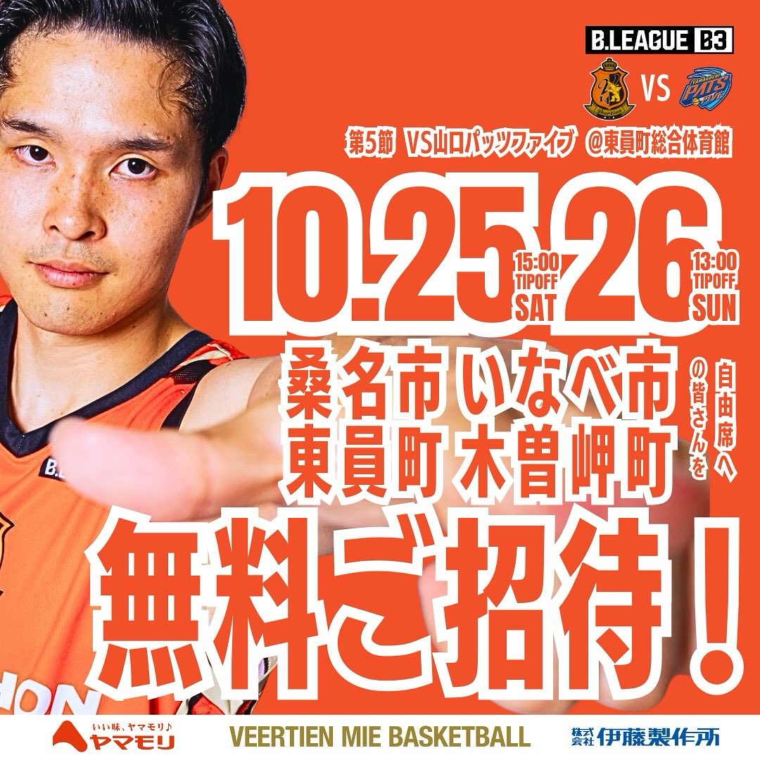 📢2025-26シーズン ホームゲーム第5節vs山口パッツファイブ🗓️10月25日(土)、26日(日)📍東員町総合体育館ホームゲームの概要をお知らせします‼️桑名市 いなべ市 東員町 木曽岬町の方ご招..