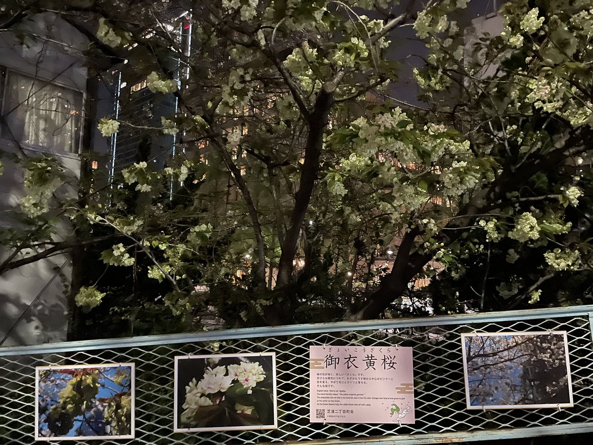 芝浦には、緑の花が咲く珍しい桜「御衣黄桜(ぎょいこうざくら)」が咲いています。夜もまた映えます。