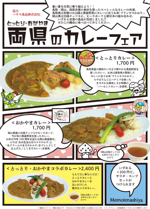 とっとり・おかやま夏カレーフェア(8/1~)暑い夏をカレーで元気に乗り越えよう!!鳥取県は自慢の大山鶏と県産野菜にカレーに合うお米「プリンセスかおり」、岡山県は白桃チャツネに、ピーチポークと朝日米の組..