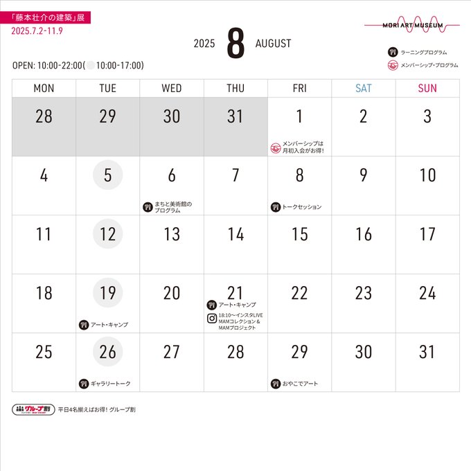 今月の森美術館カレンダーをチェック!現在、森美術館では「藤本壮介の建築」展を開催中。猛暑が続く8月は、家族や友人と一緒に涼みながら、作品鑑賞してみてはいかがでしょうかCheckoutthismonth..