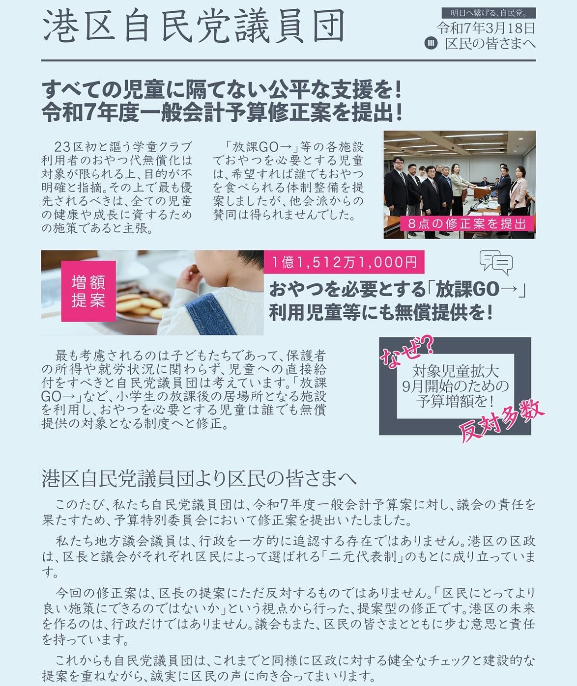 令和7年度港区議会第1回定例会が終了いたしました。大波乱の1ヶ月でした。清家区長の元初めての予算編成案は無事可決され次年度に向けて2268億円の予算が組まれました。代表質問に始まり、予算特別委員会での..