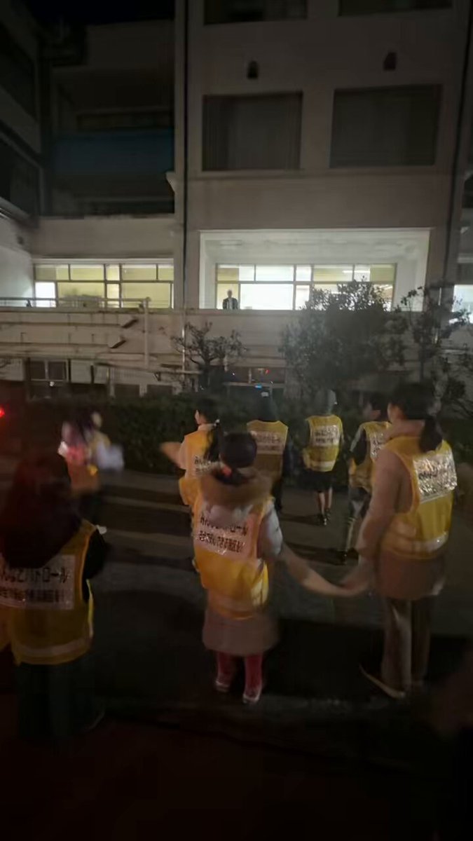 【お台場キッズパトロール】 お台場ではこどもたちが夜警を行なってくれました キッズパトロール中の子ども達と、それを見守る校長先生 #台場 #キッズパトロール #夜警 #火の用心