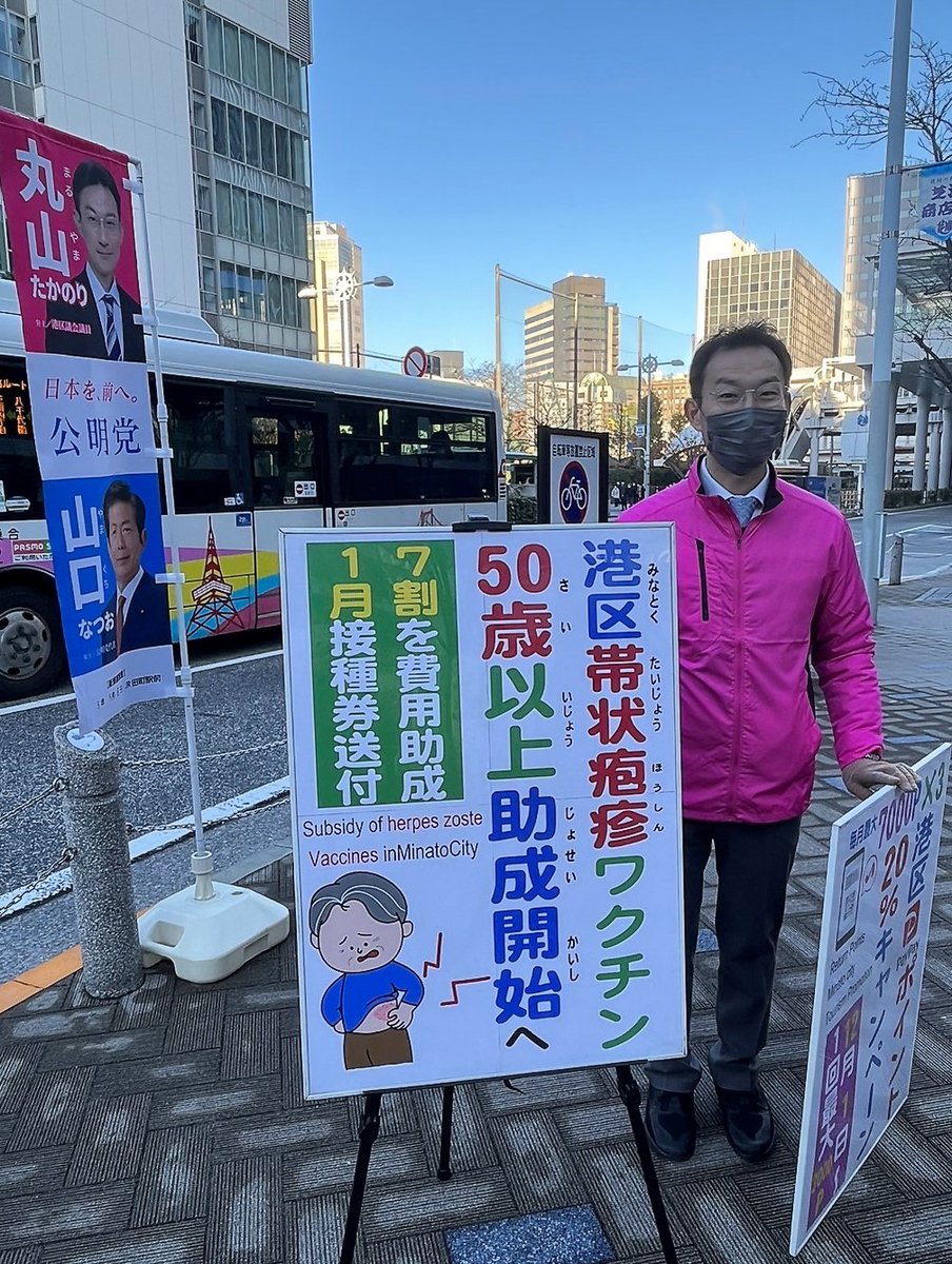 田町駅芝浦口の街頭で、#港区#帯状疱疹ワクチン費用助成を🙋♂️50歳以上区民を対象に、費用の7割助成(生ワクチン6500円、不活化ワクチン15000円×2回)💉1月開始で、対象者には接種予診票送付📬..