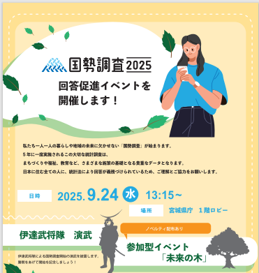 【開催】国勢調査2025回答促進イベント 伊達武将隊による回答促進キャラバンを開催します! ●錦町公園(仙台オクトーバーフェスト2025会場内)(9月19日(金曜日) 午後5時~) ●県庁1階(9月24日(水曜日)午後1時15分~) ●イオンモール石巻(9月26日(金曜日)午前11時~) https://pref.miyagi.jp/soshiki/toukei/kokusei2025-top.html…