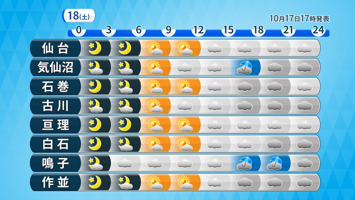 【あす18日(土)の宮城の天気】午前中は晴れ間が出ますが、午後は雲が広がり、夕方以降は県北や西部中心に所々でにわか雨。降る時間は短いですが、午後の外出は折り畳み傘があると安心。最低気温は13℃前後。け..
