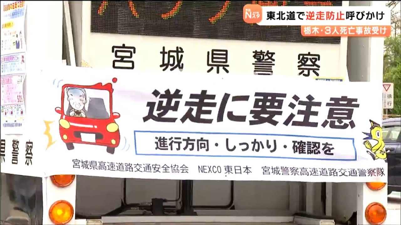 栃木県内の東北自動車道で逆走した車が正面衝突するなどして3人が死亡した事故を受け、2日に宮城県内の東北道のサービスエリアで警察がドライバーにチラシを配り逆走の防止を呼びかけました。東北道の長者原サービ..