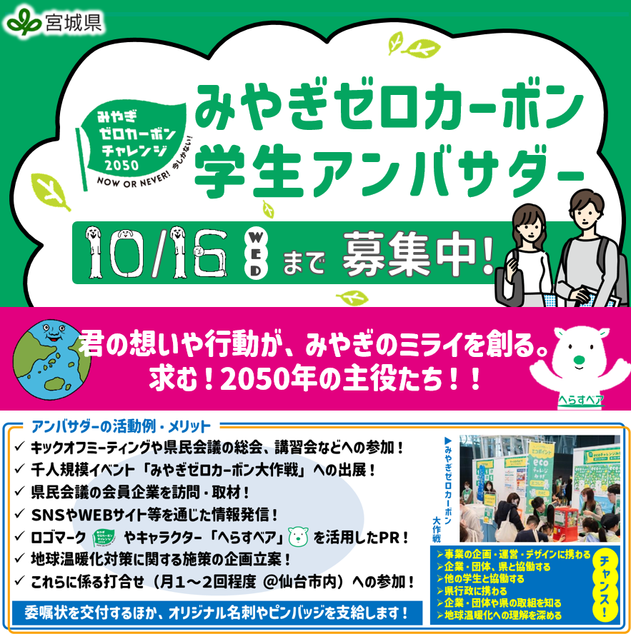 \みやぎゼロカーボン学生アンバサダー募集!/県は、2050年脱炭素社会の実現の担い手である学生の皆さまが、みやぎゼロカーボンチャレンジ2050県民会議の活動に主体的にご参画いただけるよう、「学生アンバ..