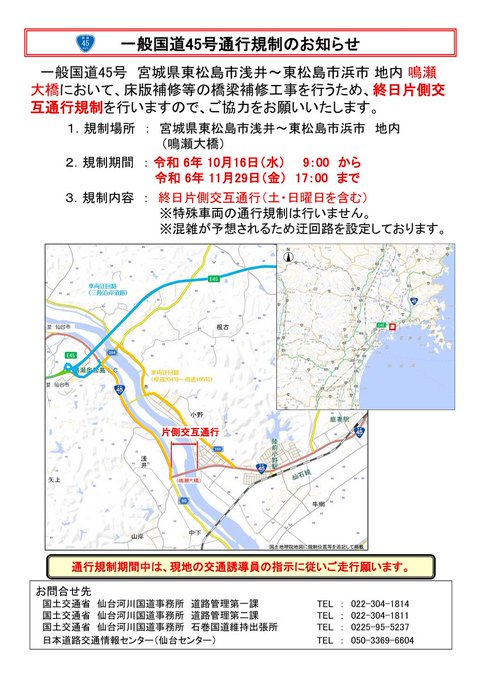 一般#国道45号#終日片側交互通行規制のお知らせ鳴瀬大橋(宮城県東松島市浅井~浜市地内)を通行される皆様には、ご不便をおかけしますが、ご理解とご協力をお願いいたします。令和6年10月16日(水)9時か..