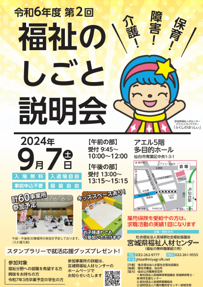 9/7(土)福祉のしごと説明会をアエル5階で開催します★午前と午後60法人参加予定!参加予定法人一覧はこちらから→https://fukushi.miyagi-sfk.net/job/2180/#宮城..