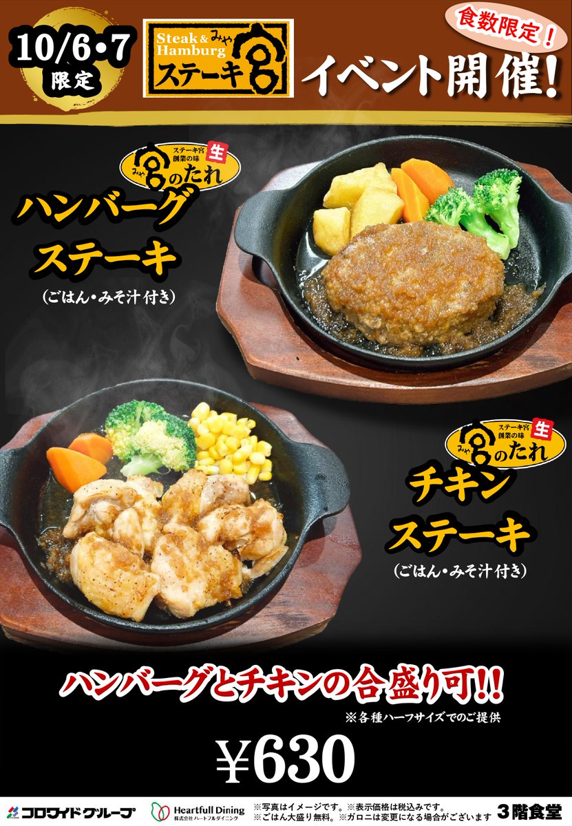 【注目!】&【予告!】10/6(月)・7(火)各日35食限定今回はステーキ宮の創業の味名物「宮のソース」を使用した特製ハンバーグチキンステーキ定食が登場します!合盛り(ハーフ&ハーフ)もOK!..