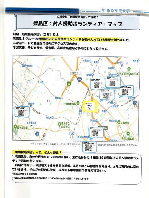 心理学科 ̄V ̄ ̄ ̄ ̄ ̄ ̄ ̄地域援助演習豊島区の大学近辺にはどのような対人援助ボランティアの募集があるのかをグループで調べマップにまとめました今後、学生は、自分が希望する施設等で、夏休みを中心に対人援助..