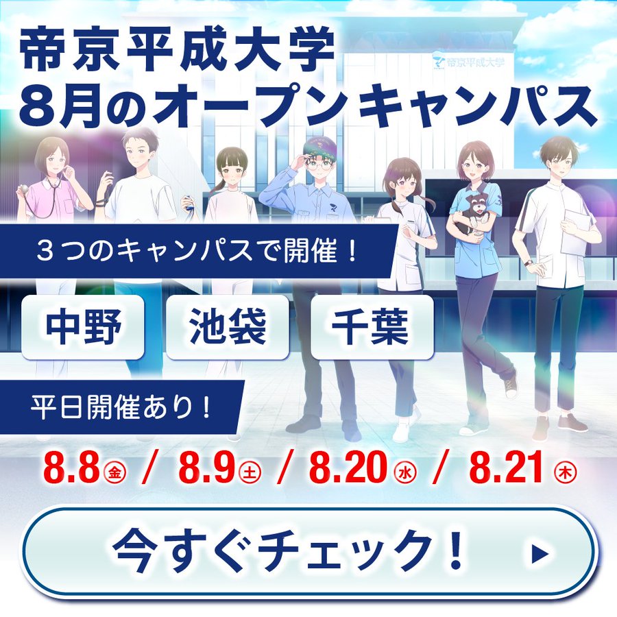 【夏のオープンキャンパス開催!】この夏、帝京平成大学で“学びの体験”しませんか?体験授業・入試説明・個別相談など、進路に役立つプログラムが盛りだくさん開催日程8/8(金)8/9(土)8/20(水)8/..