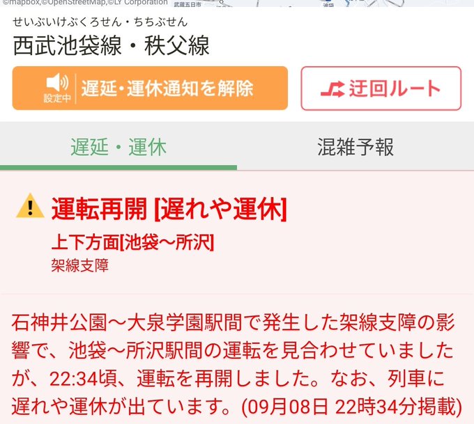 西武鉄道、 西武池袋線は22:34に運転再開の報が入ってきました。 お伝えします。 詳しくは、西武鉄道Xか、駅係員。 Y!乗り換え案内などをご覧ください。 写真は乗り換え案内からです。