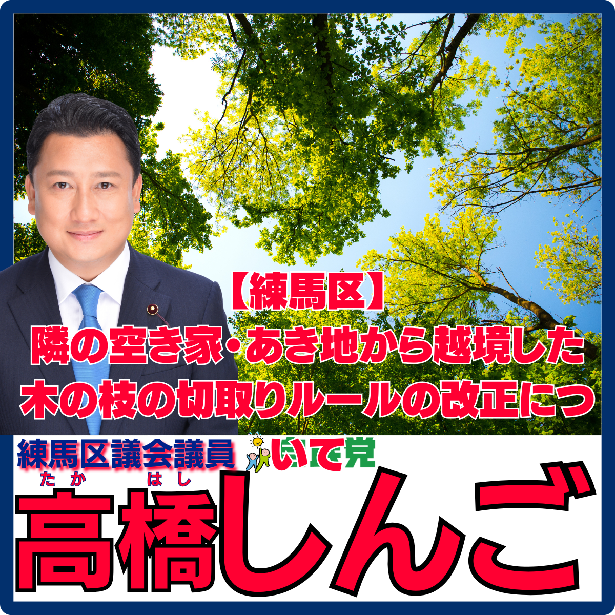 こんにちは、練馬区議会議員高橋しんごです。 今日のタイトル“隣の空き家・あき地から越境した木の枝の切取りルールの改正について”民法改正による「越境樹木」の切除ルール見直しの意義令和5年4月1日施行の民..