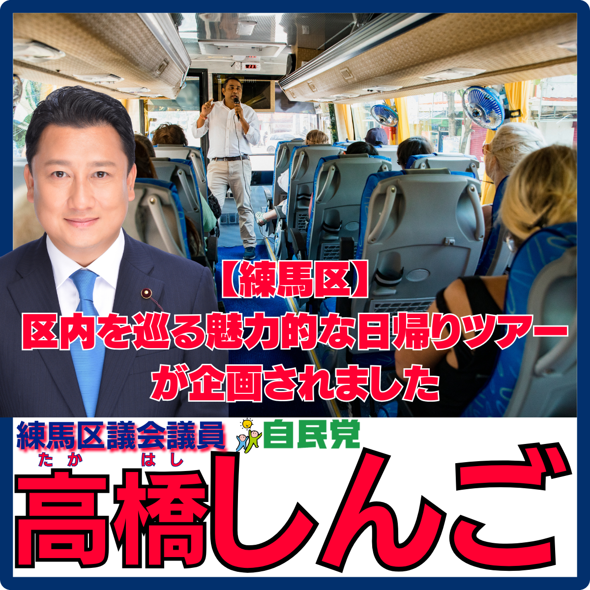 皆さま、こんにちは。練馬区議会議員の高橋しんごです。このたび、練馬区では「ようこそ練馬ぶらり旅」と題し、区内を巡る魅力的な日帰りツアーが企画されました。区からの周遊促進事業として位置づけられており、旅..