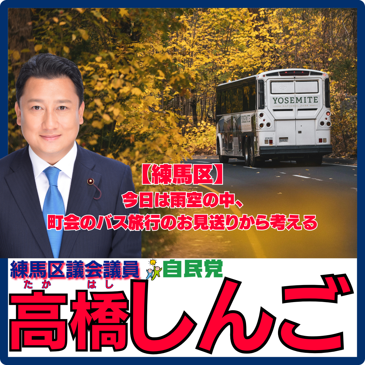 こんにちは、練馬区議会議員高橋しんごです。 今日は雨空の中、町会のバス旅行のお見送りからスタート以前より参加人数が少なくなっている様に感じるのが“町会のバス旅行”町会のバス旅行者不足は、地域コミュニテ..