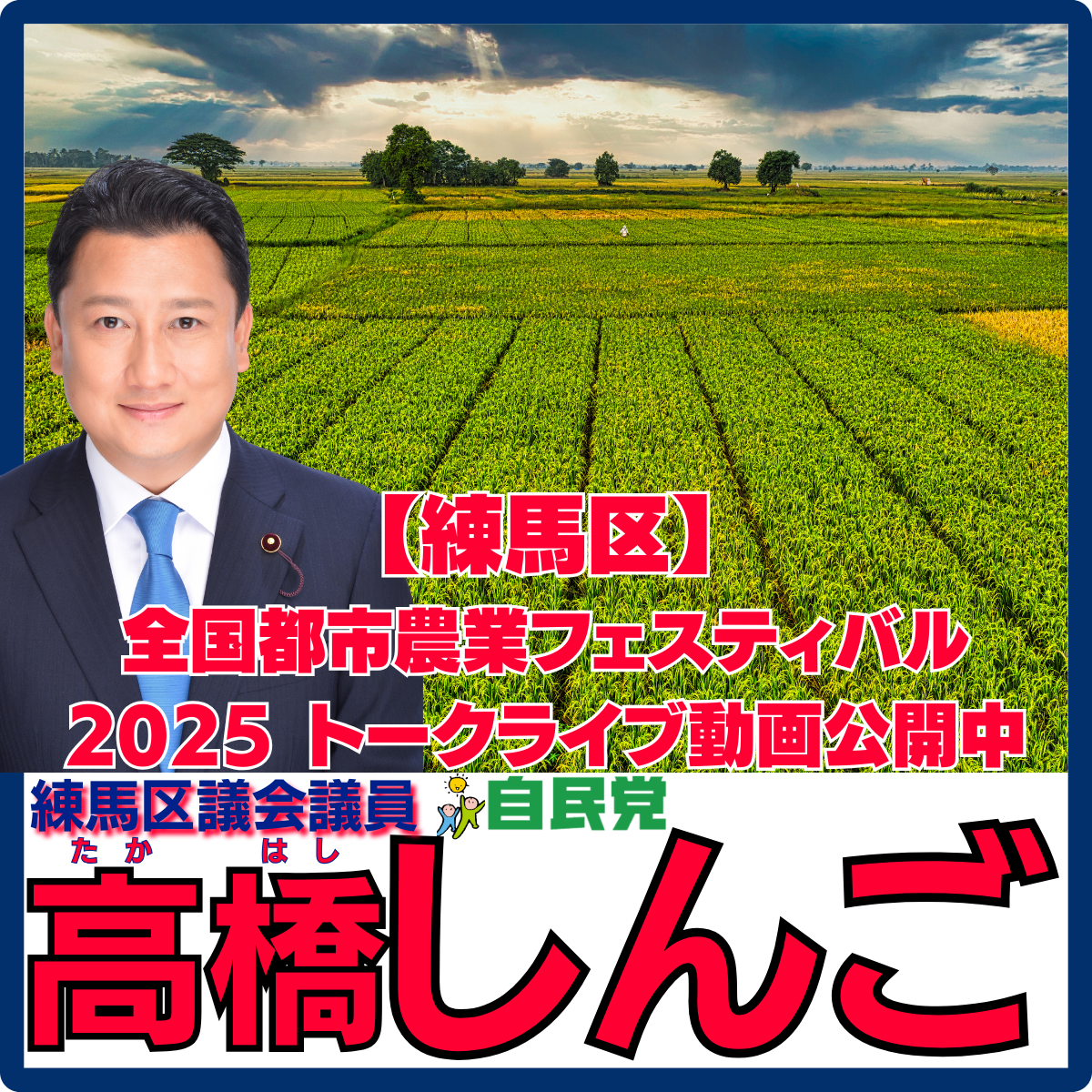 こんにちは、練馬区議会議員高橋しんごです。全国都市農業フェスティバル2025トークライブ動画令和7年11月15日(土曜)・16日(日曜)に開催した「全国都市農業フェスティバル2025」では、都市農業に..