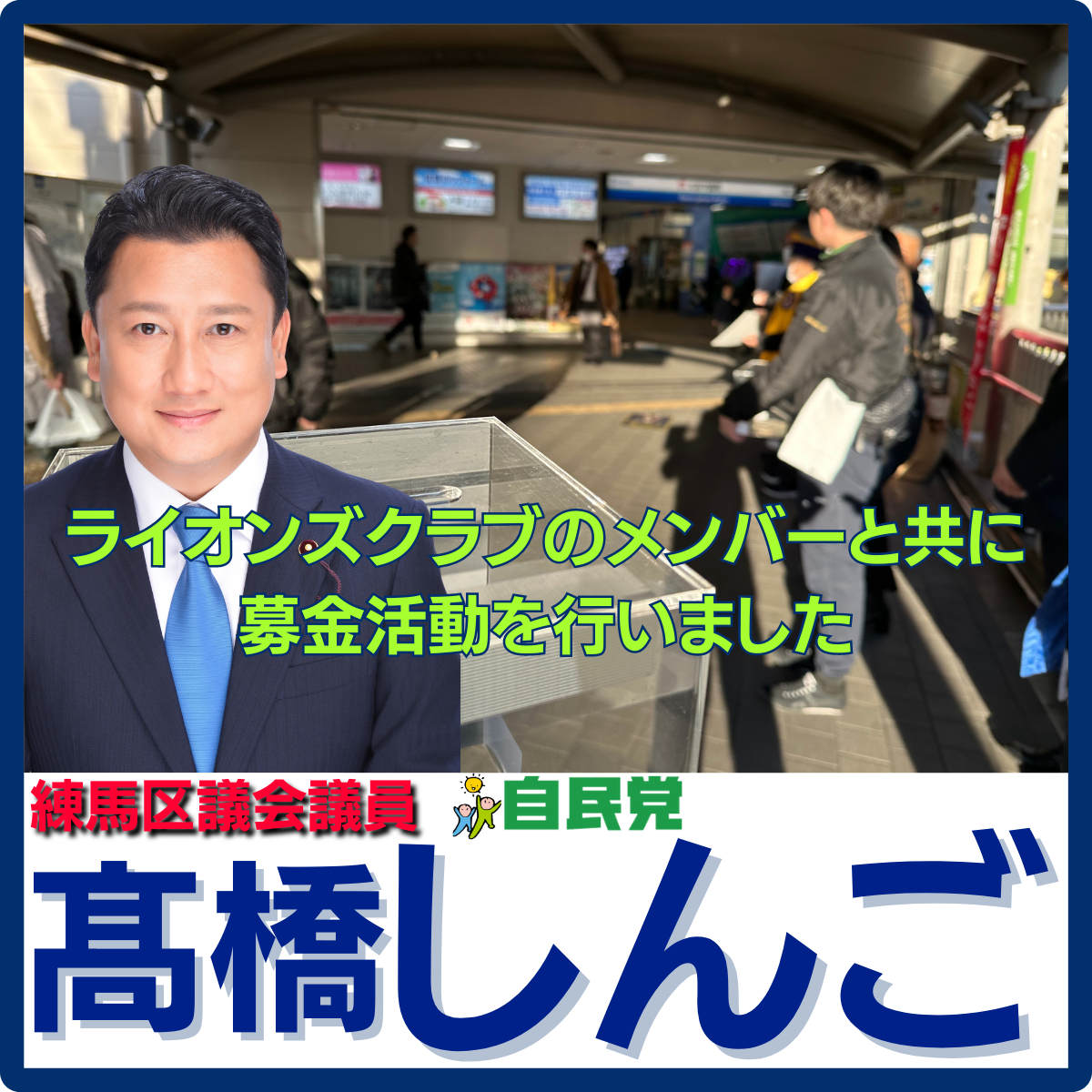 こんにちは、練馬区議会議員高橋しんごです。 先日、ライオンズクラブのメンバーと共に、募金活動を行いました。今回の募金は練馬区内の所属する各ライオンズラブと合同で実施、大泉学園駅前にて活動しました。 ラ..