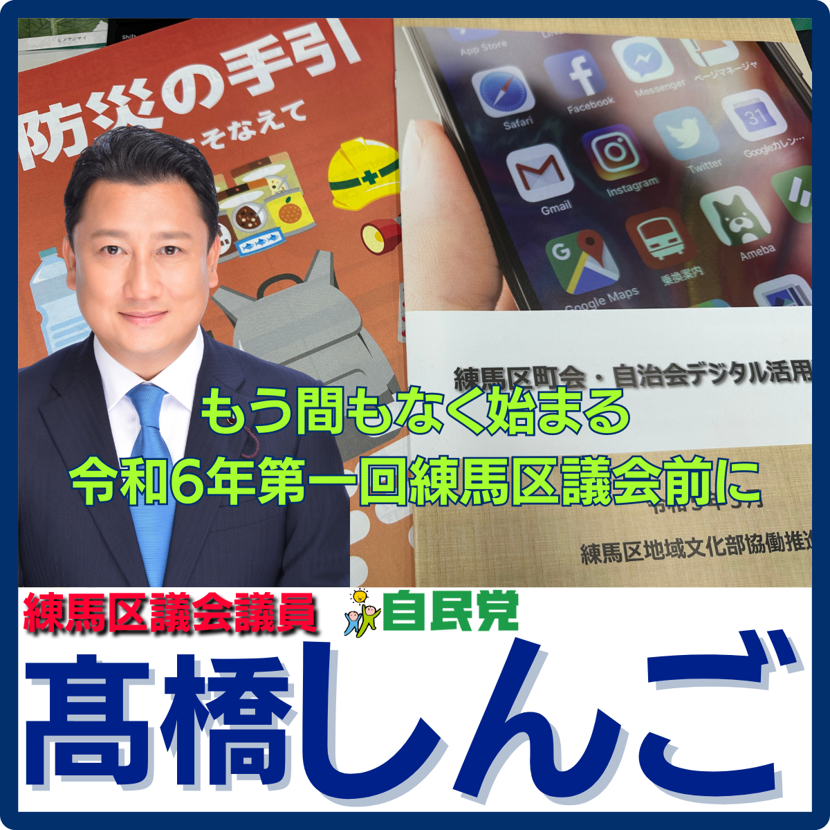 こんにちは、練馬区議会議員高橋しんごです。 もう間もなく始まる令和6年第一回練馬区議会前に今日も役所で色々と打合せ。 先日もお伝えしましたが、各町会・自治会さんともに抱える課題は色々あります。そんな..