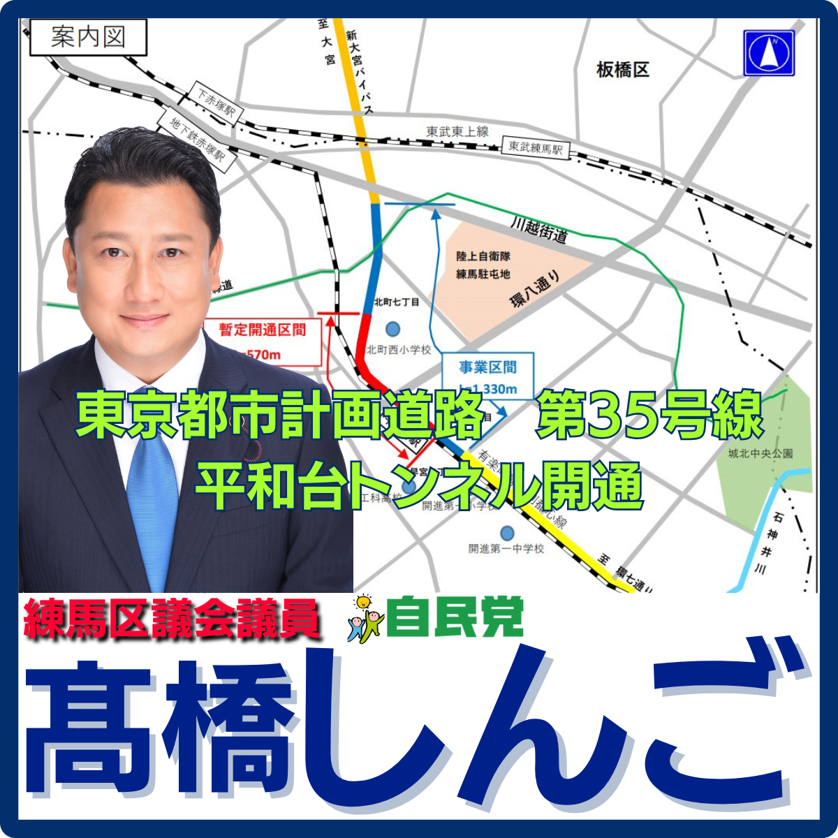 こんにちは、練馬区議会議員高橋しんごです。 東京都が整備を進めている東京都市計画道路幹線街路放射第35号線のうち、練馬区平和台四丁目から練馬区北町七丁目までの570メートルの区間(地下トンネル構造等..