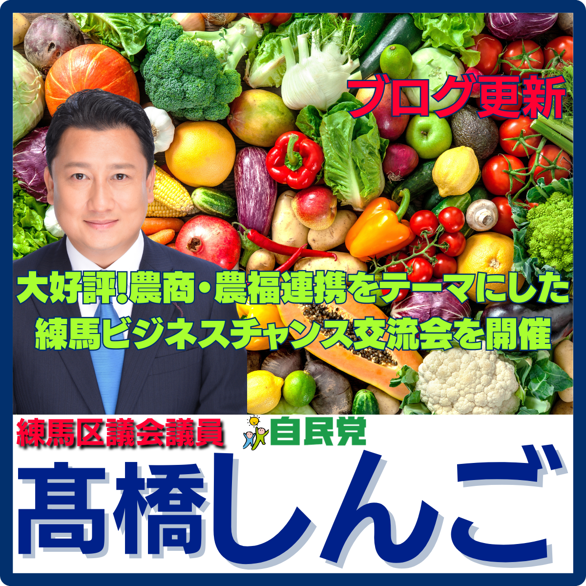 こんばんは、練馬区議会議員高橋しんごです。 大好評!農商・農福連携をテーマにした練馬ビジネスチャンス交流会を開催です。 事業者同士の交流により商取引につなげるため、練馬ビジネスチャンス交流会を..