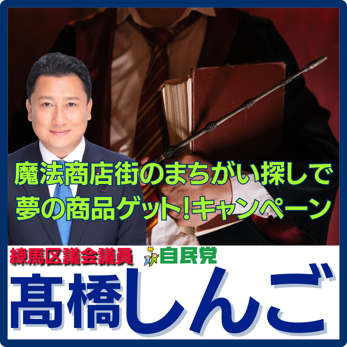 こんにちは、練馬区議会議員高橋しんごです。 練馬区商店街連合会では、1日から、「魔法」をテーマに「魔法商店街のまちがい探しで夢の商品ゲット!キャンペーン」を実施します。 凄いことに、抽選で“合計1,..