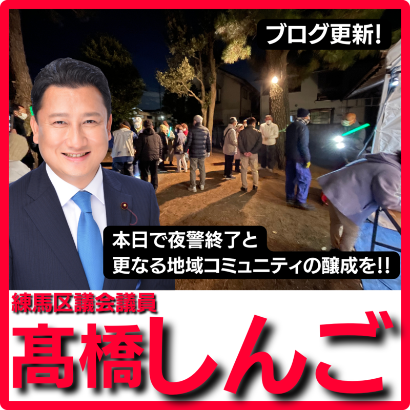 こんばんは、練馬区議会議員髙橋しんごです。 地域では昨日で夜警のピークが過ぎ