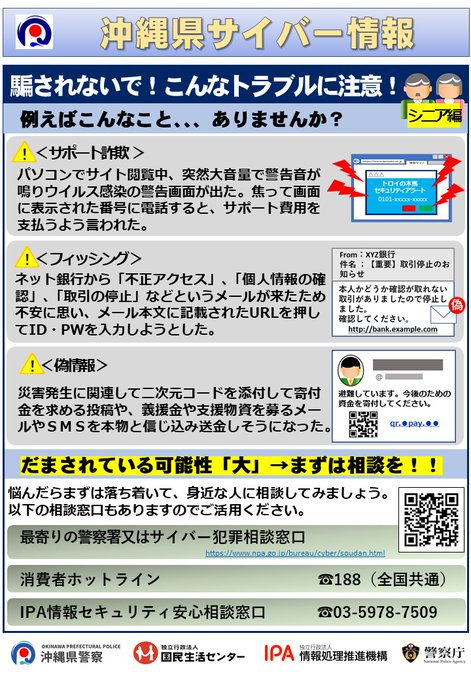 県内でサイバー犯罪やネットトラブルなどの相談が増加中!「サポート詐欺」「フィッシング詐欺」など、様々なトラブルが発生しています。少しでもおかしいなと感じたら、一人で判断せず、周りの人に相談しましょう。..