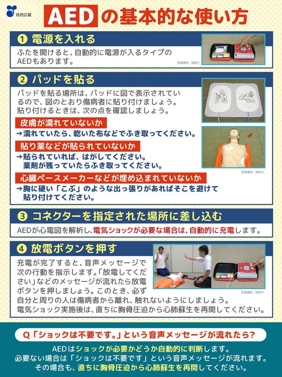 /身につけておきたい応急手当AEDはどう使う?\AEDは、駅や公共施設を始め、様々な場所に設置されています。もしもの時に備えて操作手順を確認しておきましょう。使用の際は全て機械が音声メッセージを出して..