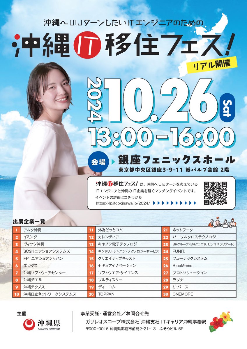 沖縄IT移住フェスITエンジニアに向けた移住転職イベントの参加者を募集します!沖縄の企業とブースで交流できるほか、移住者によるトークセッションも行います!日時:10/26(土)13:00~16:00会..