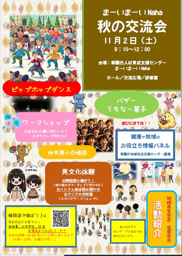 まーいまーいNaha秋の交流会子どもからお年寄りまで、地域をもっと好きになる、イベント開催!!異文化交流(ベトナム・韓国)もあり!うちなー菓子もあり!地域の子ども達のダンスや合唱団、楽しめる内容満載!..