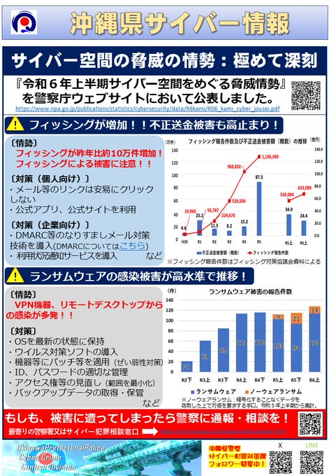 令和6年上半期のサイバー犯罪の検挙状況等を県警及び警察庁のホームページで公開しています。県内での相談件数は年々増加しており、注意が必要です。詳細は県警ホームページをご確認ください。https://po..