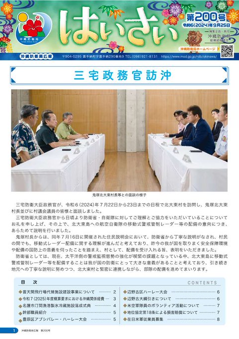 広報誌「はいさい」最新号(第200号)を発刊しました。沖縄防衛局HPに掲載していますので、こちら(以下URL)からご覧ください。https://mod.go.jp/rdb/okinawa/pr/hai..