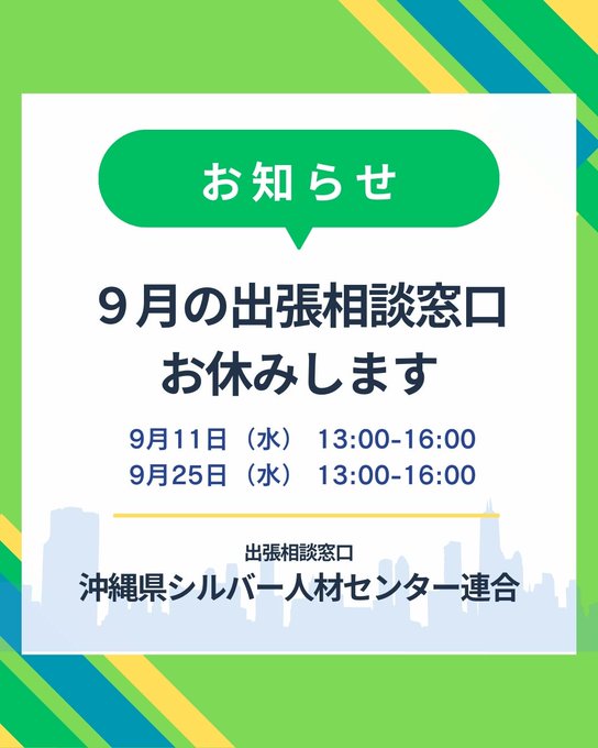 /出張相談窓口お休みのお知らせ\以下の日程で出張相談窓口【沖縄県シルバー人材センター連合】お休みいたします。・9/11(水)13:00-16:00・9/25(水)13:00-16:00次回10/9(水..