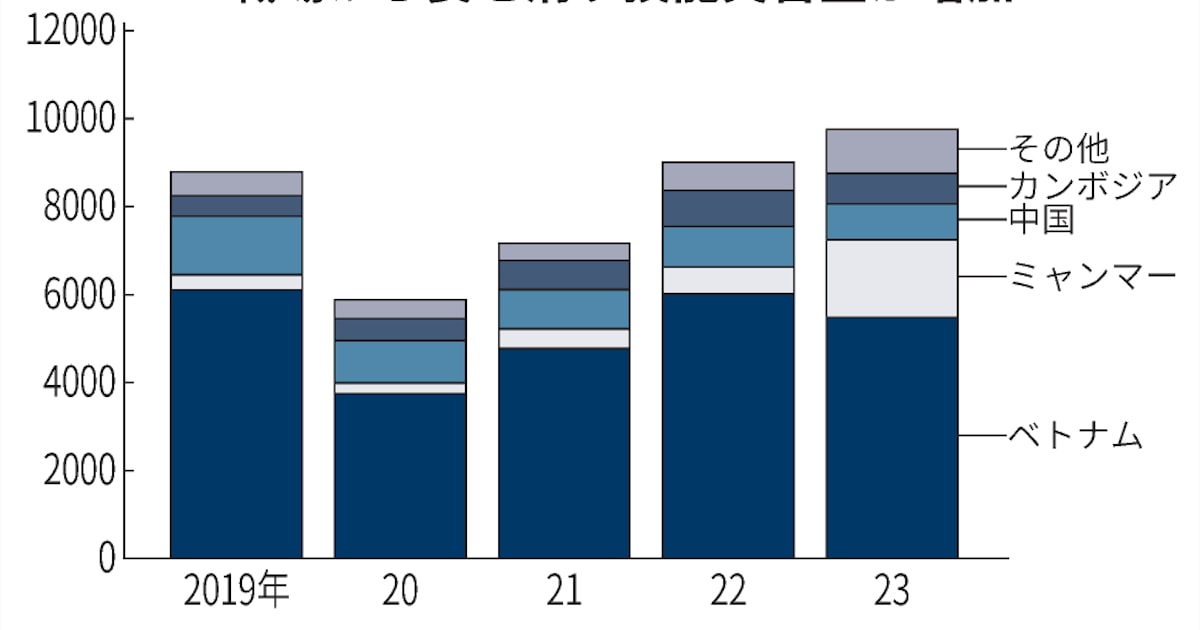 技能実習中に失踪した外国人が2023年は9753人で過去最多だったことが2日、出入国在留管理庁への取材で分かった。