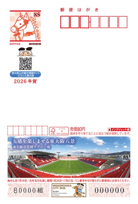 /10月30日から広告付き年賀はがきを販売!\花園ラグビー場やトライくんをあしらった、広告付き年賀はがきを10月30日(木)から販売します。◇販売場所:市内の全郵便局◇販売価格:1枚80円詳しくはこち..