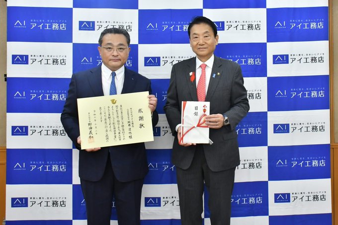 /子育て世帯を応援(株)アイ工務店へ感謝状を贈呈\大阪市北区に本社がある(株)アイ工務店より、企業版ふるさと納税の制度を活用し3000万円、また、同社代表取締役会長田中亘様個人より1000万円の寄附を..