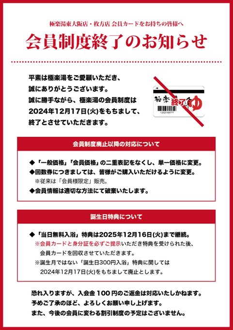 会員制度終了のお知らせ平素は極楽湯をご愛顧いただき、誠にありがとうございます。誠に勝手ながら、極楽湯の会員制度は2024年12月17日(火)をもちまして、終了とさせていただきます。会員制度廃止以降の対..
