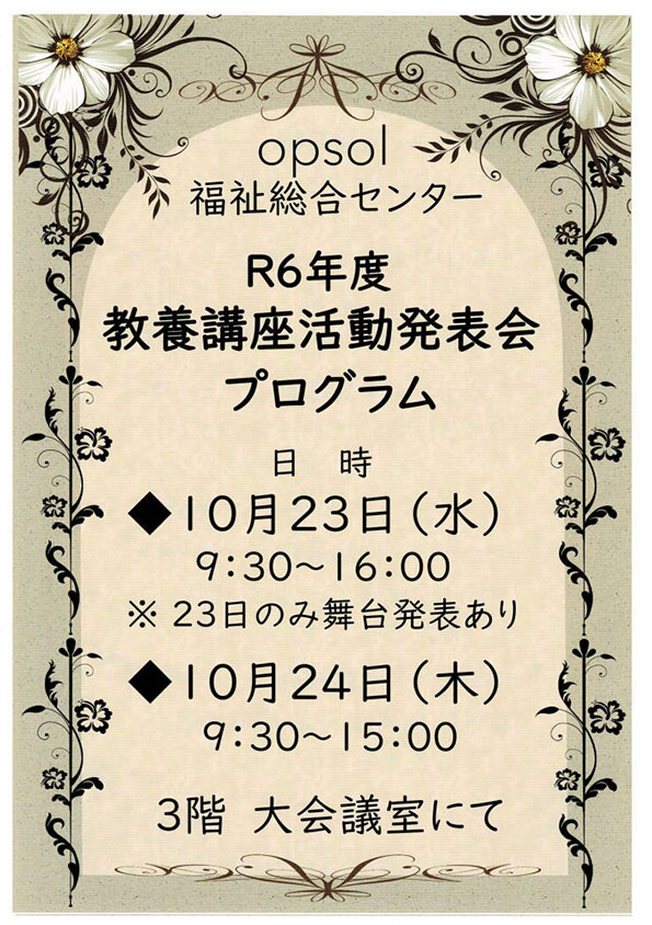 今年度から、10月開催。ぜひご覧ください。【opsol福祉総合センターで令和6年度教養講座活動発表会が行われます】https://kishibura.jp/blog/hiyori/2024/10/op..