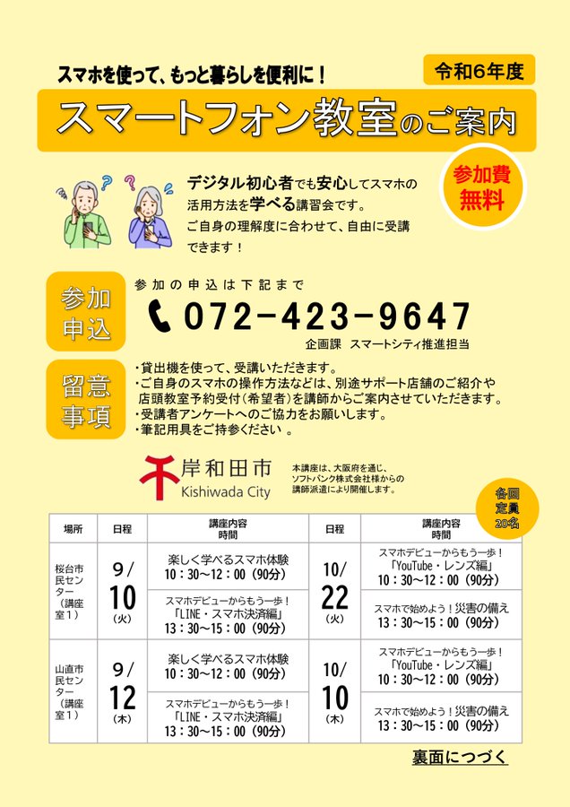 スマホを使って、もっと暮らしを便利に!貸出機を使ったスマートフォンの講座(全員)なので、スマートフォンをお持ちでない方も参加できます。詳しくはこちらhttps://city.kishiwada.osa..