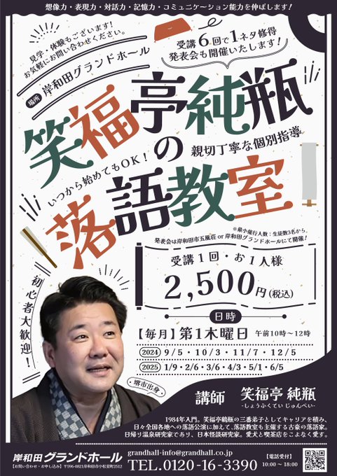 ー・ー・ー・ー・ー岸和田グランドホールにて待望の!\落語教室開講/ー・ー・ー・ー・ー先生は、笑福亭純瓶さん教室は毎月1回(第1木曜午前中)想像力、表現力、対話力、記憶力、そしてコミュニケーション能力も..