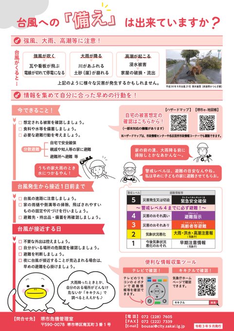 台風10号が接近中です。堺市では一昨年に防災マップをリニューアル。区別やシニア世代・子育て世帯向け等も用意。この週末にご一読いただき、台風に備えてください。堺市も皆様を守るために力を尽くします。 ◆防災マップ一覧 https://city.sakai.lg.jp/kurashi/bosai/kangaeru/pamphlet/bosai/bosaimap23/hazardmap.html… ◆台風、大雨への備え https://city.sakai.lg.jp/kurashi/bosai/shiru/fu
