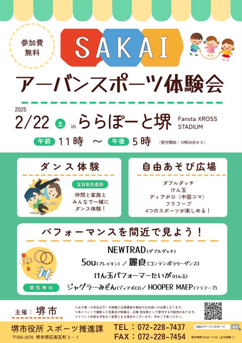 \アーバンスポーツを楽しもう!/2/22(土)、ららぽーと堺で、SAKAIアーバンスポーツ体験会が開催されます!ダンス、ダブルダッチ、けん玉などの体験のほか、プロによる圧巻のパフォーマンスも披露されま..