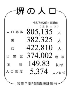 令和7年2月1日付、堺市の人口発表です。前月からは665人の人口減少、世帯数は192世帯の減少でした。自然動態は全区でマイナス、社会動態は中・東区でマイナス。