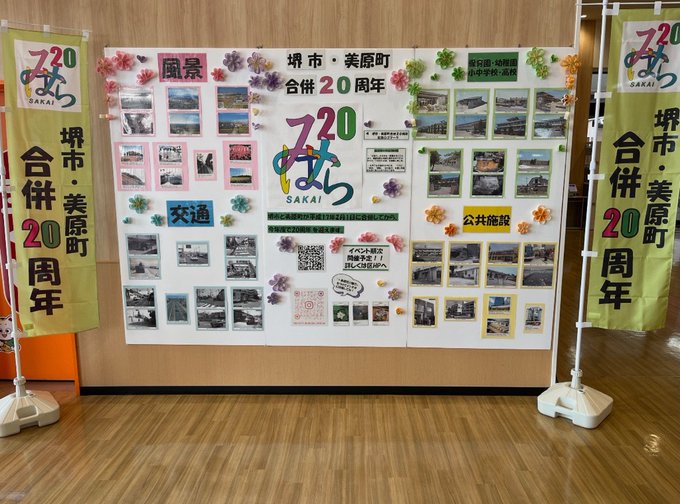 \パネル展を実施します!/堺市・美原町合併20周年を記念し、これまでの歩みを振り返る写真や、市民の皆さまからのSNS投稿写真を展示しますぜひお越しください!展示期間1/18,19美原区役所本館1階風の..