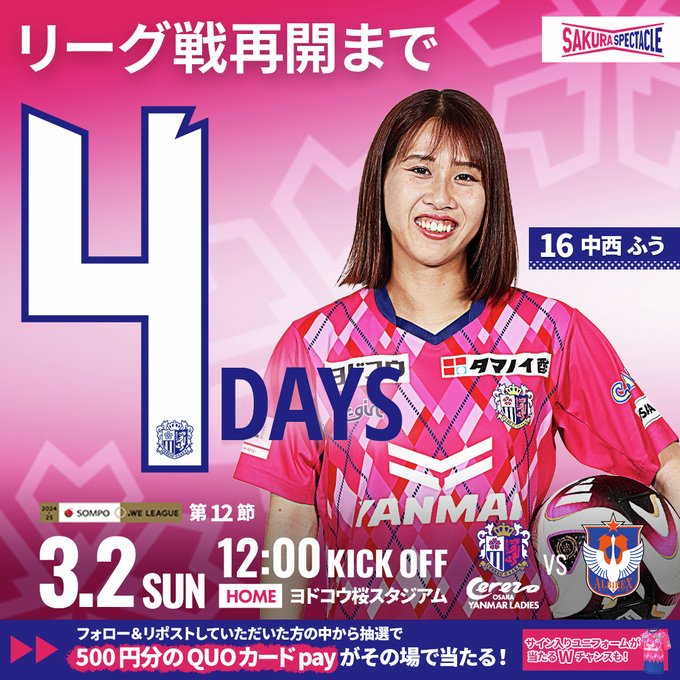 SOMPOWEリーグ再開まであと4日!#セレッソ大阪ヤンマーレディース応援キャンペーン抽選で毎日#500円分のQUOカードを6名様に#プレゼントさらに寄せ書きユニフォームがあたるWチャンスも【応募方法..