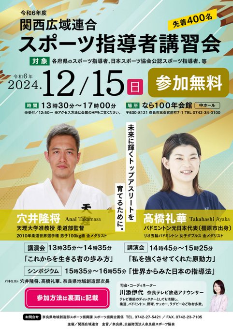 \関西で行われる講習会のお知らせ/令和6年度関西広域連合スポーツ指導者講習会【開催日】12月15日(日)13:30~17:00【場所】なら100年会館中ホール穴井隆将氏、髙橋礼華氏による講演会とシンポ..