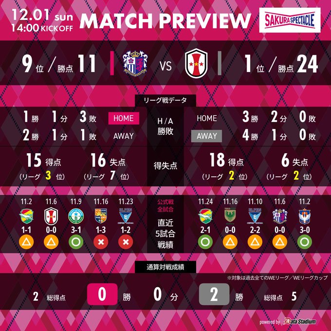 2024-25SOMPOWEリーグ第11節データプレビューINAC神戸レオネッサ12/114:00キックオフ#ヨドコウ桜スタジアム#セレッソ大阪ヤンマーレディース#ダイヘンサポーティングマッチ#BAT..