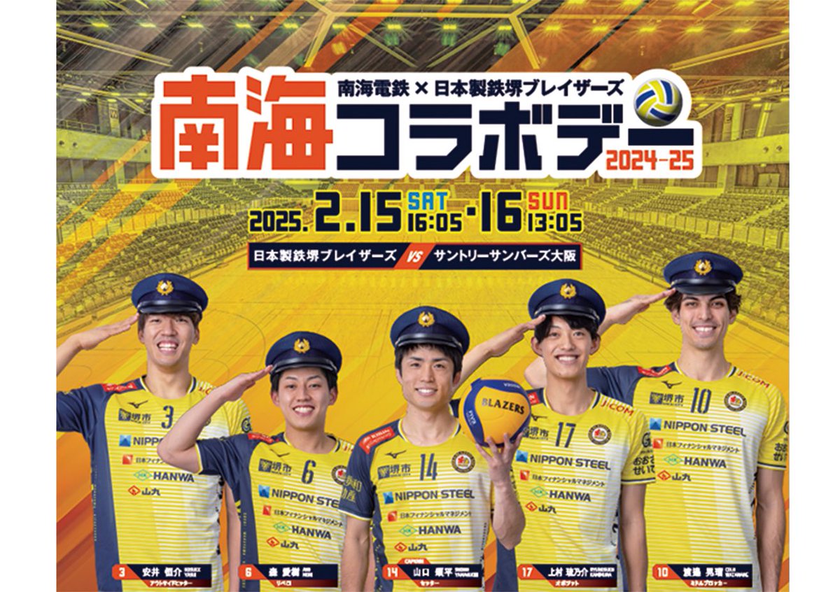 南海コラボデー2024-25今季も開催南海電鉄とコラボした「南海コラボデー2024-25」来場者限定でノベルティのプレゼントや、南海コラボデーならではの会場演出など楽しい企画が盛りだくさん当日は南海電..